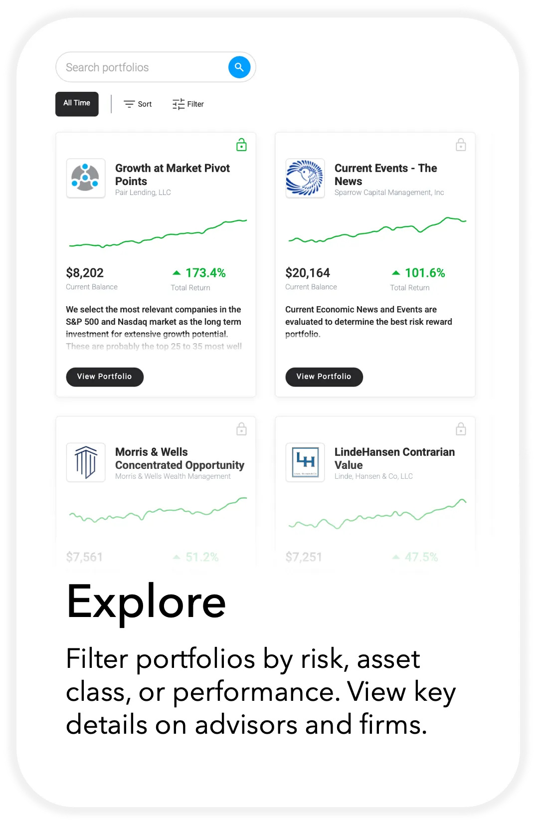 Explore portfolios from registered portfolio managers who normally manage money for high-net-worth clients. Unlock a portfolio to see what they are buying and selling in real time. Then copy the same trades in your own account with one click using Echo Trade.