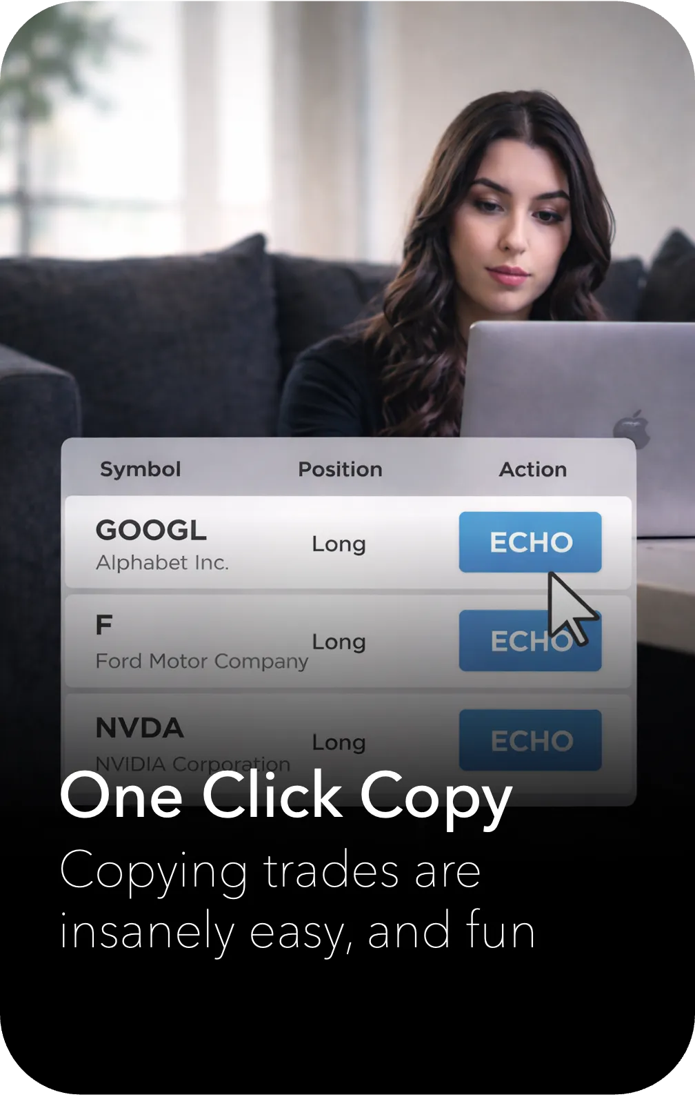 Echo Trade lets you see what registered portfolio managers are buying and selling. When they make a trade, you can copy the same trade in your own account in real time.
